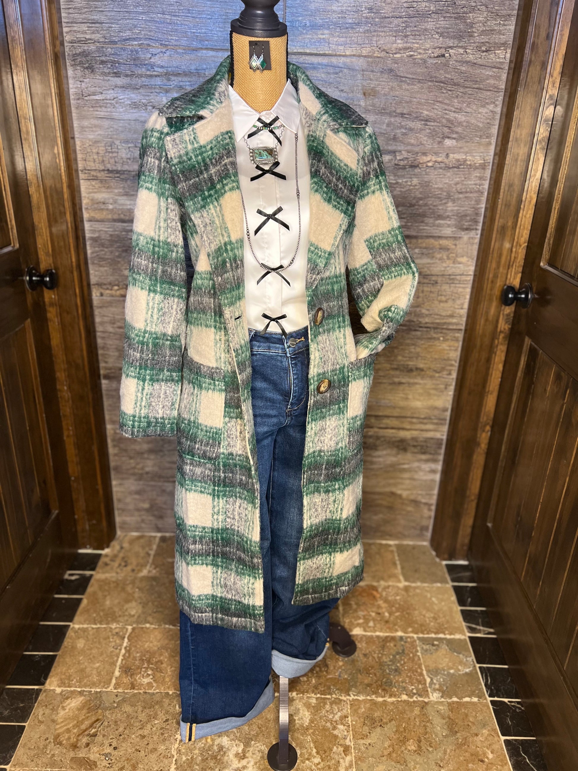 This ivory and green plaid long coat brings refined elegance to your wardrobe. Featuring a timeless tartan pattern and flowing silhouette, it drapes beautifully for a polished appearance. The generous length offers sophisticated coverage, making it an ideal layer for cooler months. Whether styled with evening wear or casual separates, this coat's classic design ensures enduring appeal and effortless versatility across seasons.